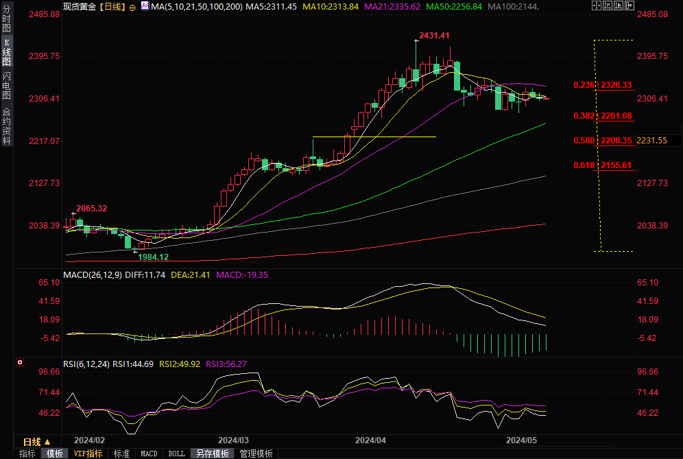 现货黄金周三全天保持震荡走势,收盘微跌0.22%,收报2308.74美元/盎司。