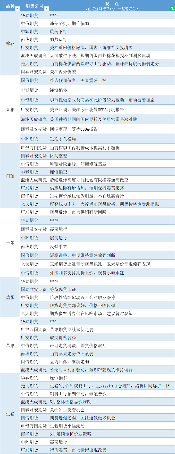 标题:期货公司观点汇总一张图:5月10日农产品(棉花、豆粕、白糖、玉米、鸡蛋、生猪等)