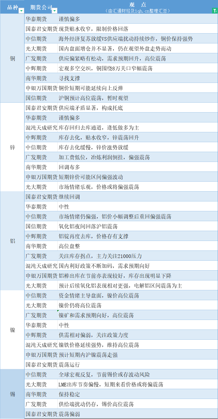 标题:期货公司观点汇总一张图:5月10日有色系(铜、锌、铝、镍、锡等)