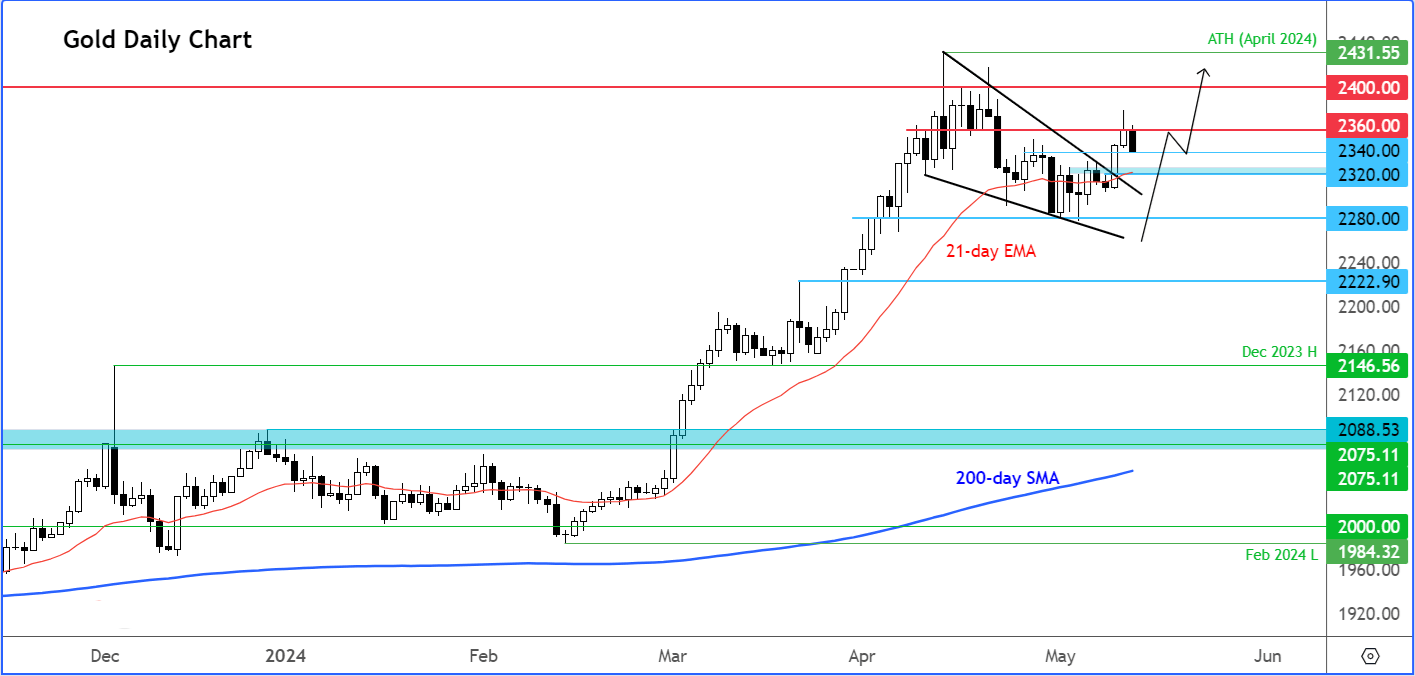 Forex.com分析师Fawad Razaqzada表示,尽管周初下跌,但黄金预测仍然看涨。继早些时候突破纪录高位后,近几周该金属一直处于下降楔形形态的范围内。然而,上周标志着这种模式的背离,表明金价可能准备再次上涨,特别是因为最近的盘整使得RSI等动量指标从之前的“超买”水平重置,无论是在价格还是在时间上。