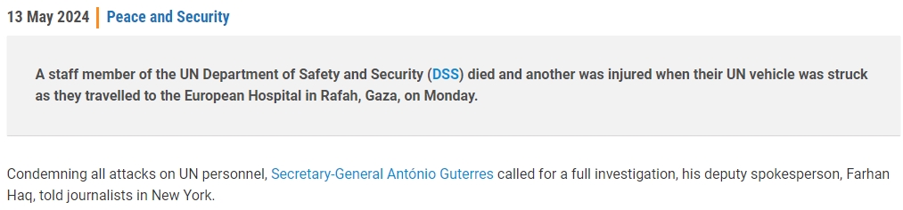 联合国周一撰文写道,联合国安全保障部(DSS)的一名工作人员在前往加沙拉法的欧洲医院时,乘坐的联合国车辆被撞,造成一名工作人员死亡,另一名工作人员受伤。#中东局势#