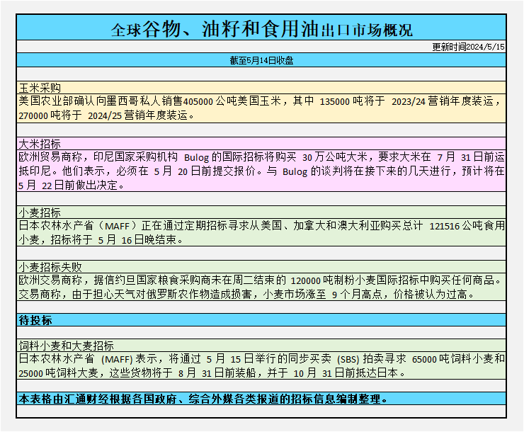 全球谷物、油籽和食用油出口市场招标、采购概况(2024/05/15):