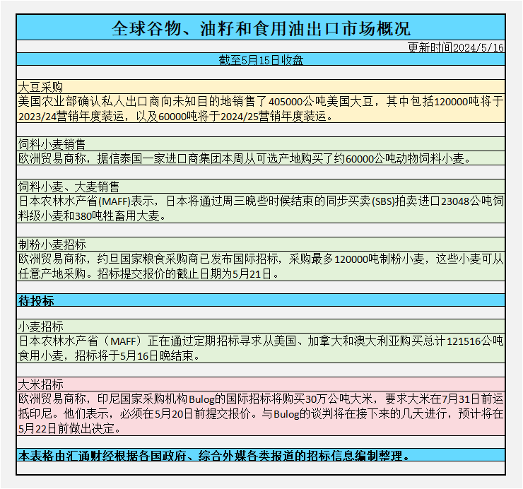 全球谷物、油籽和食用油出口市场招标、采购概况(2024/05/16)