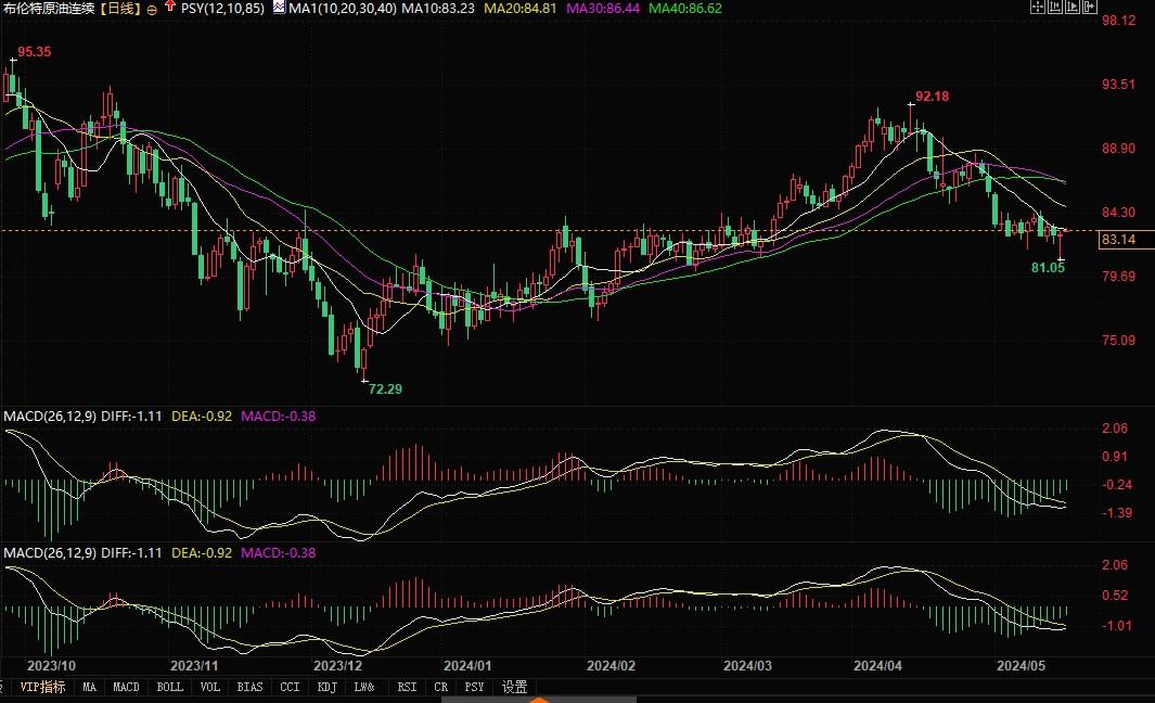布伦特原油价格一度跌至每桶80美元的低点,美国基准的西德克萨斯中质原油价格在5月迄今跌至每桶80美元以下。