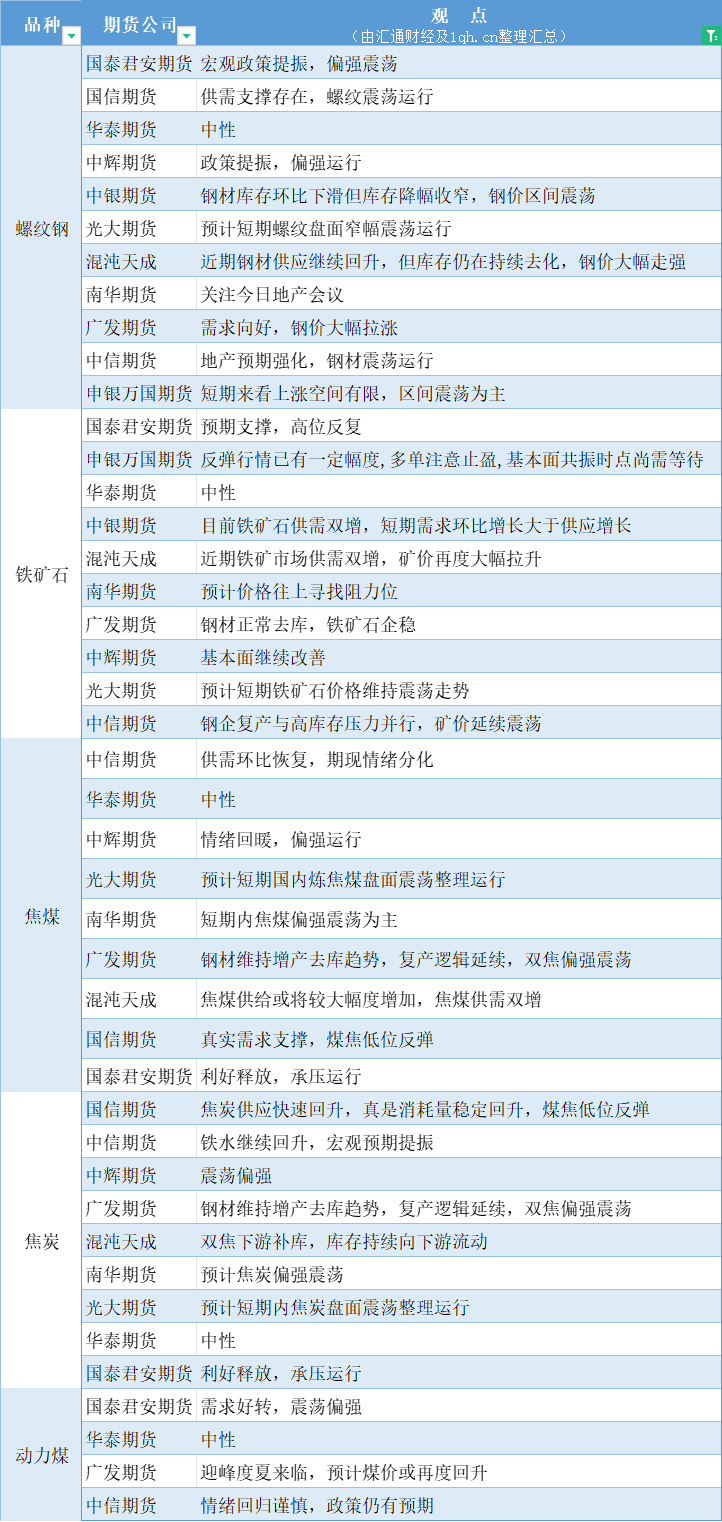 期货公司观点汇总一张图:5月17日黑色系(螺纹钢、焦煤、焦炭、铁矿石、动力煤等)