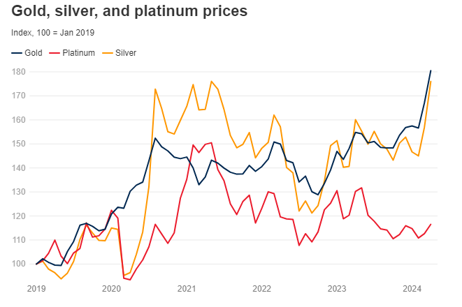 该机构经济学家和分析师在最近的一篇文章中写道:“世界银行的贵金属价格指数在2024年4月攀升了9% ,延续了第一季度以来的上升轨迹。”黄金价格在4月份达到了新的名义纪录,而白银价格接近2021年初的纪录。铂金价格本月也出现反弹。”他们补充说,地缘政治紧张局势加剧推动了油价飙升。