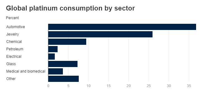 世界银行表示:“在2023年需求激增25%之后,预计铂金需求将在2024年放缓。这种预期的减速是由于汽车行业和珠宝需求的温和增长,这两个行业占全球铂金需求的60%左右。”