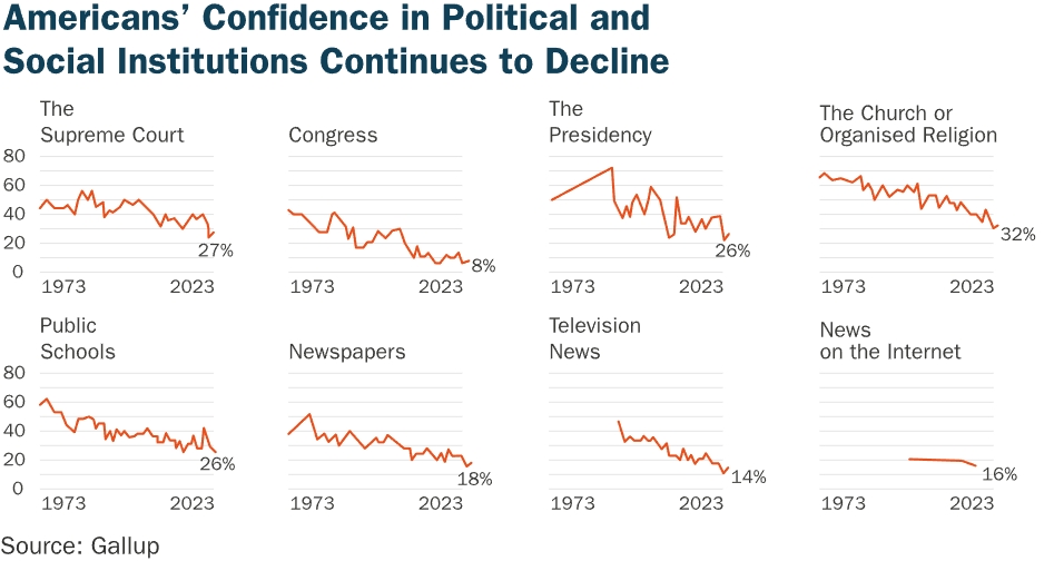 开市客是“老百姓”购物的地方,而这一典型人群非常看重信任,对美国经济、社会和政治机构的信任。下图突出显示,美国对其机构的信心全面处于历史最低水平,这可以解读为“人民”对美国随着时间的推移摧毁自身的能力的信心处于历史最高水平,他们通过传统渠道寻求更传统的出路,包括黄金等资产。