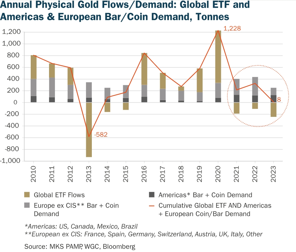 2023年全球ETF和美洲+欧洲金币/金条累计需求仅为8吨,为2013年以来的最低水平。 随着美联储进入降息周期,这些参与者的复苏是黄金2300美元与2500美元之间,以及白银28美元与35美元之间的区别。