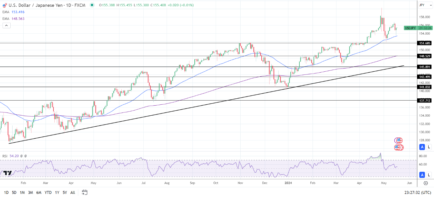美元/日元突破156关口,可能会让多头冲向158关口。如果美元/日元重返158,4月29日高点160.209可能成为下一个价格目标。