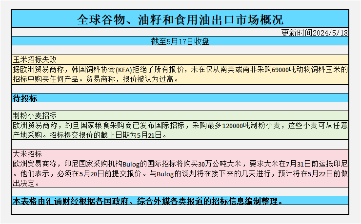 全球谷物、油籽和食用油出口市场招标、采购概况(2024/05/18):