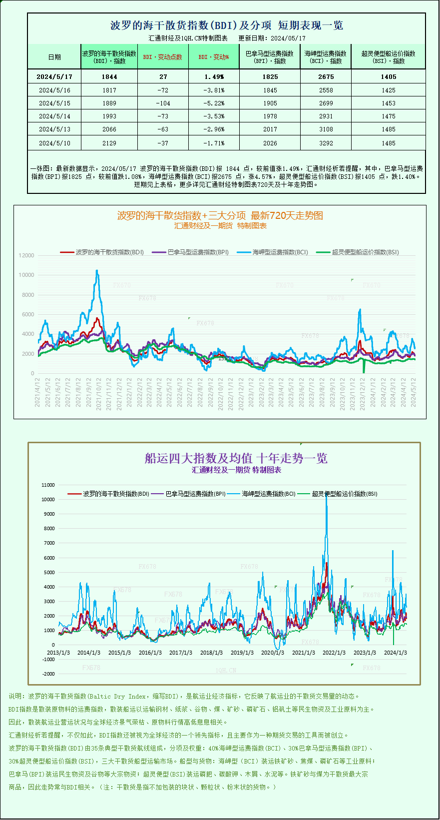 汇通财经APP讯——最新数据显示,2024/05/17 波罗的海干散货指数(BDI)报 1844 点,较前值涨1.49%,其中,巴拿马型运费指数(BPI)报1825 点,较前值跌1.08%,海岬型运费指数(BCI)报2675 点,涨4.57%,超灵便型船运价指数(BSI)报1405 点,跌1.40%。波罗的海干散货指数+三大分项的最新720天走势图、十年走势图等详见汇通财经特制图表。