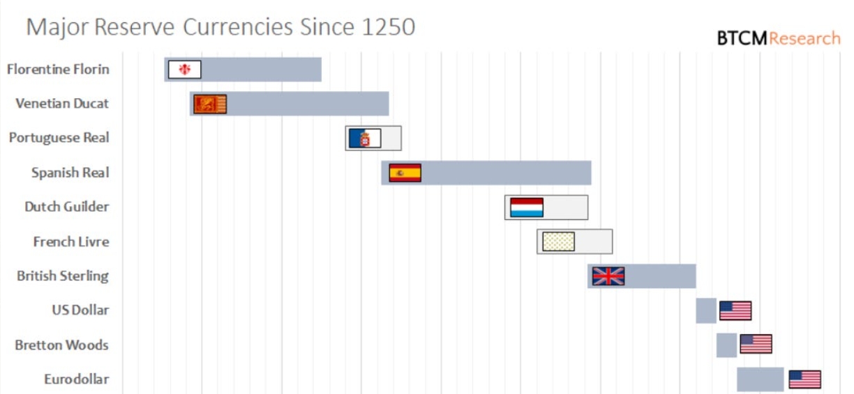 下表显示了历史上主要的储备货币,以及它们成为全球储备货币的大致年份: