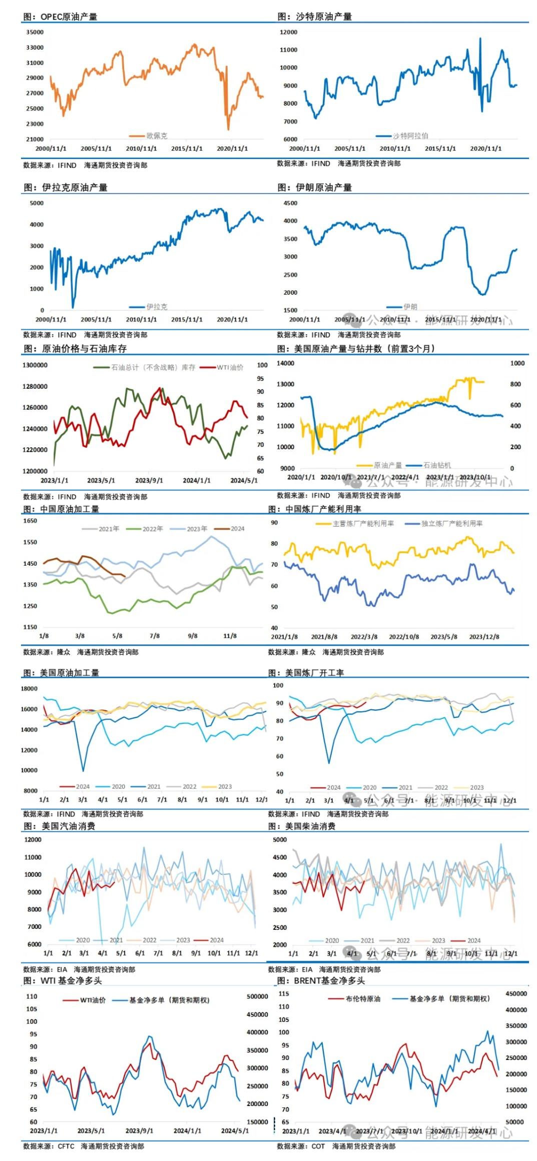 本周欧佩克、国际能源署先后公布了5月月报,2份月报没有给市场带来信心,国际能源署(IEA)周三发布的5月月报进一步给油市带来了压力,IEA下调了对2024年石油需求增长的预测,进一步扩大了该机构与欧佩克在今年全球石油需求前景方面的分歧。IEA将今年的石油需求增长预期下调14万桶/日,至110万桶/日,主要原因是经经合组织发达国家的需求疲软。IEA表示,工业活动低迷和又一个暖冬削弱了今年的柴油消费,尤其是在欧洲,那里的柴油汽车份额下降已经削弱了消费量。再加上今年年初美国柴油交付量疲软,这足以导致经合组织国家第一季的石油需求再次陷入萎缩。与之相比,欧佩克预计2024年全球石油需求将增加225万桶/日。IEA判断预计2025年全球石油需求将增长120万桶/日,略高于此前预测。即使欧佩克+自愿减产措施继续实施, 2024年的供应增幅仍有58万桶/日至创纪录的1.027亿桶/日。2025年全球石油供应可能会增加180万桶/日。3月份全球石油库存激增3460万桶,因水上石油升至疫情后新高;早期数据显示,4月份全球石油库存进一步上升。而欧佩克公布的月报则强调尽管存在一些下行风险,2024年全球经济增长仍有进一步上行潜力。世界经济2024年和2025年世界经济增长预测维持不变,分别为2.8%和2.9%。美国2024年和2025年的经济增长分别小幅上调至2.2%和1.9%。维持2024年全球石油需求增长预测不变,仍为225万桶/日。维持2025年全球石油需求增长预测不变,仍为185万桶/日。欧佩克称由于一季度石油需求表现好于预期,一季度数据小幅上调,包括经合组织美洲数据和中国数据。然而,这一增长被中东地区在第二季度和第三季度的向下修正所抵消,原因是这两个季度的预期略有下降。另外欧佩克取消了对自身石油需求的预测,今后将只公布对DOC原油需求的预测,预计2024年对DOC原油的需求为4320万桶/日。欧佩克4月原油产量减少48,000桶/日至2658万桶/日。二手资料显示,尼日利亚4月原油产量减少4.6万桶/日,至135.4万桶/日。伊拉克4月原油产量减少3.2万桶/日,至418.1万桶/日。 伊朗4月原油产量增加1.4万桶/日,至321.2万桶/日。 沙特4月原油产量增加0.2万桶/日,至902.9万桶/日。