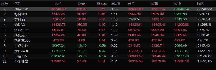 美股收盘情况:道琼斯工业指数上涨0.59%,至33745.69点;