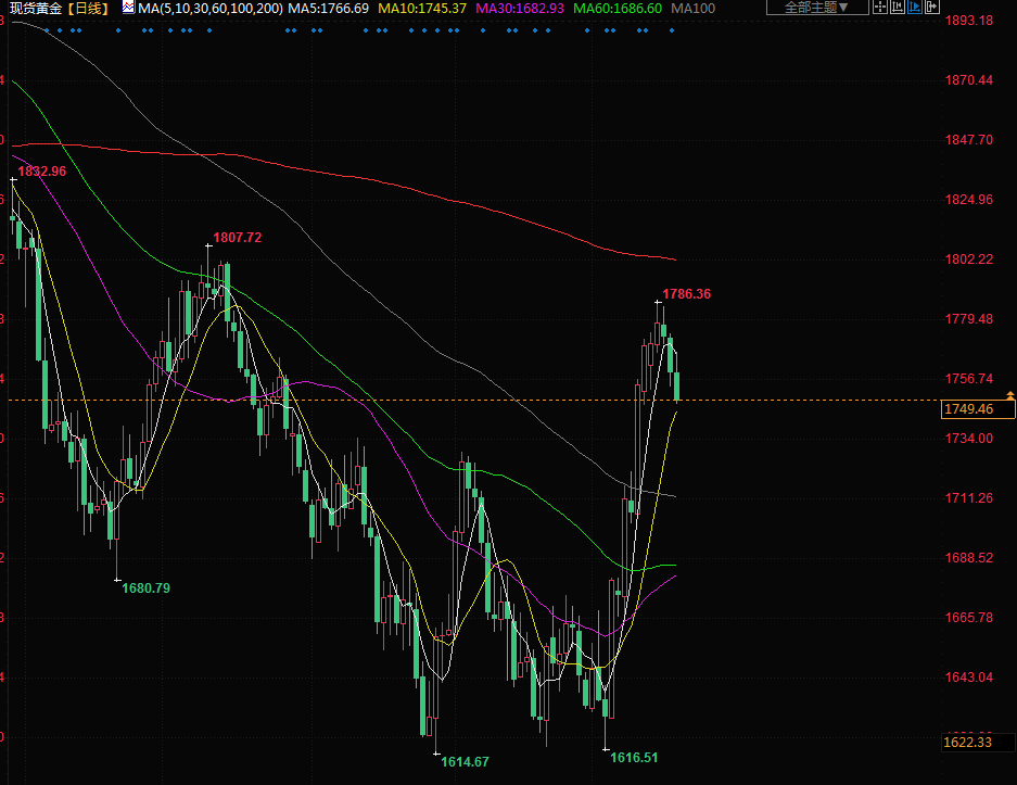 金价周五下跌,周线也下跌,美联储官员表示,将继续提高利率以抗击通胀。现货金下跌0.7%,报每盎司1748.84美元,周线下跌约1.3%,为10月中以来最大跌幅。