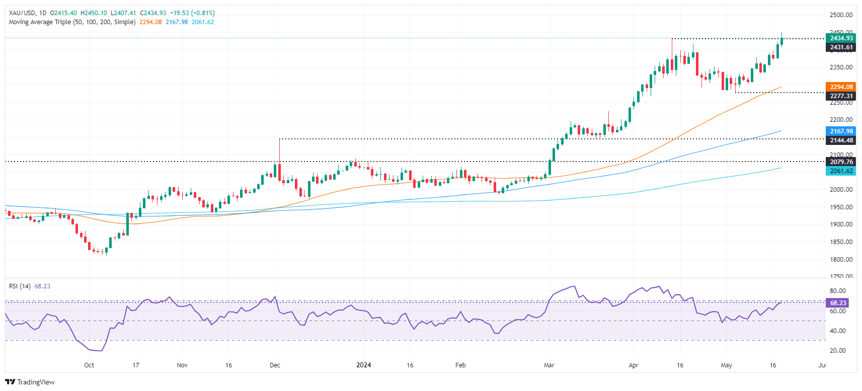 FXStreet分析师Christian Borjon Valencia指出,金价在触及2450美元/盎司的历史新高后,仍将测试更高价格,这可能为进一步上涨打开大门。交易者应该知道,随着相对强弱指数(RSI)继续走高,但尚未达到超买水平,动能支持买家。