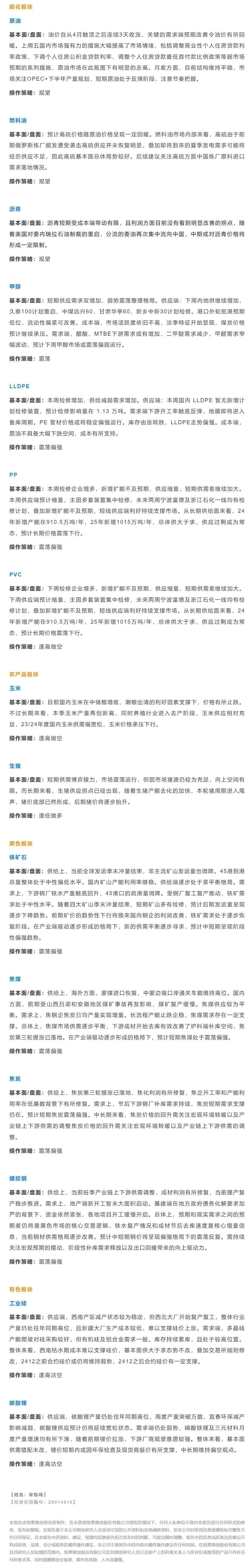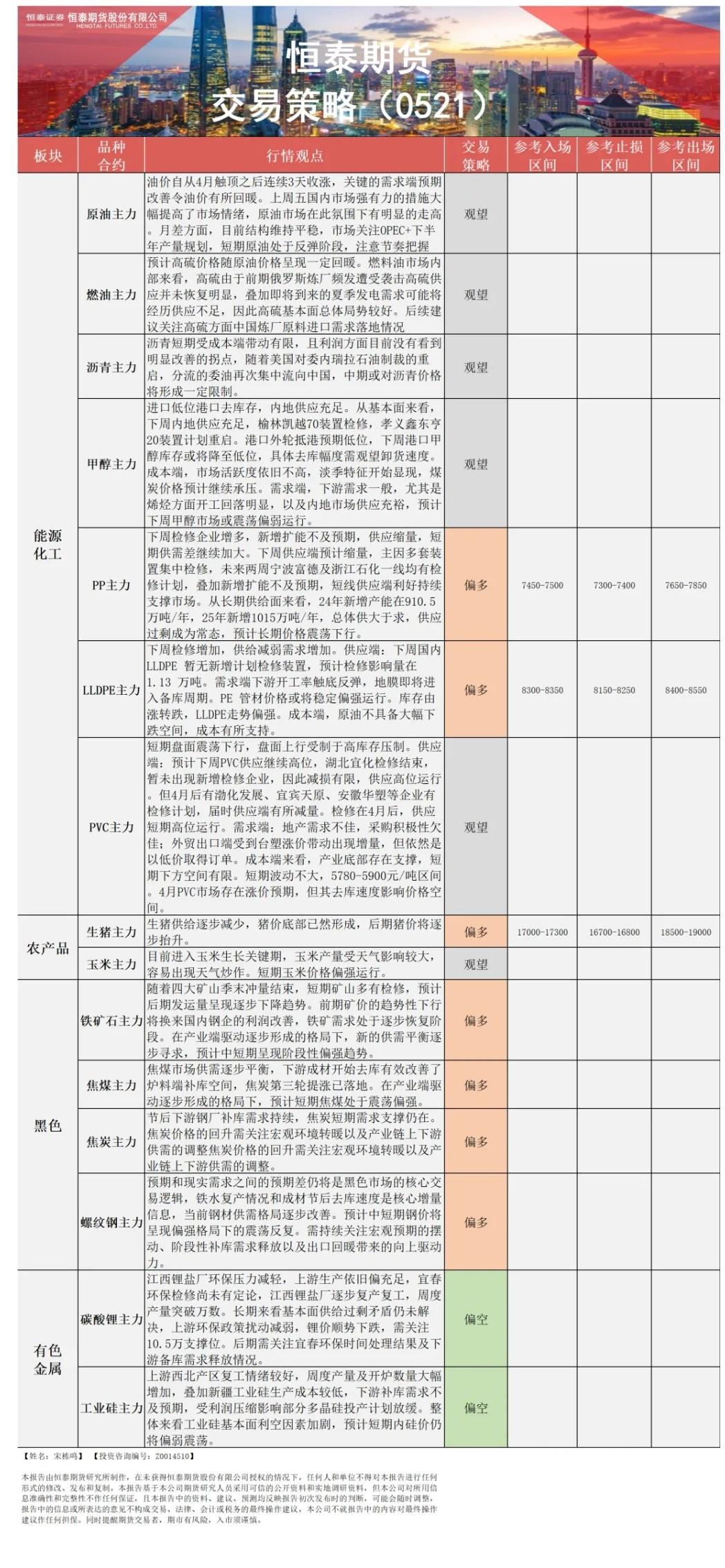 以下是恒泰期货今日早间交易策略,覆盖品种有:原油燃料油等能源化工、玉米生猪等农产品、黑色系如铁矿石焦煤焦炭螺纹钢、有色系如工业硅碳酸锂等。