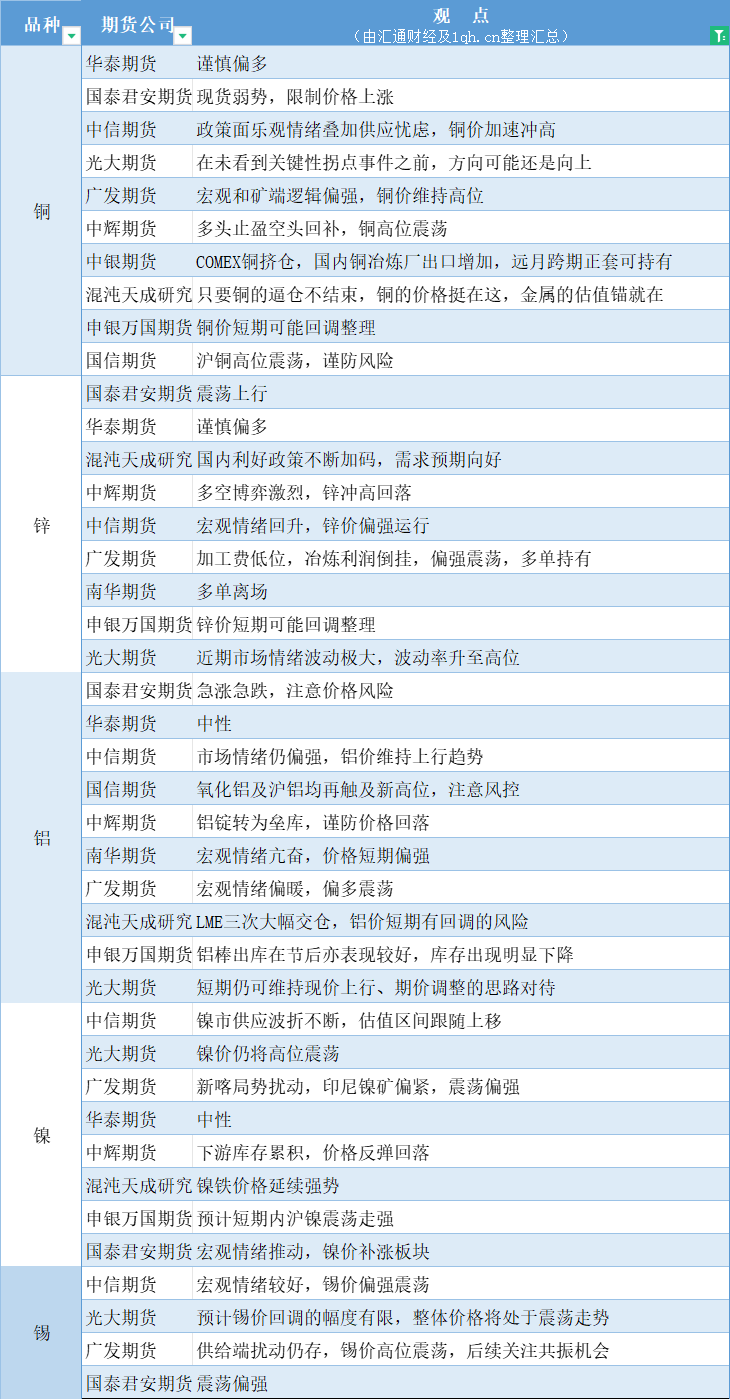 标题:期货公司观点汇总一张图:5月22日有色系(铜、锌、铝、镍、锡等)