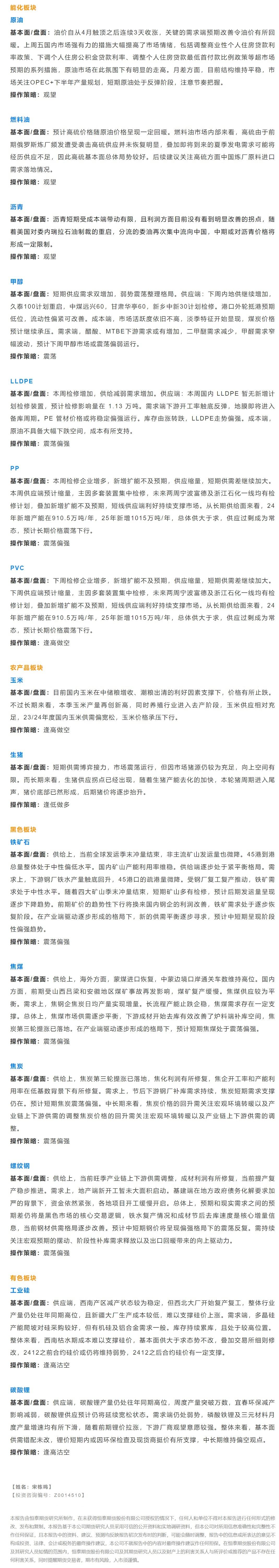 以下是恒泰期货今日早间交易策略,覆盖品种有:原油燃料油等能源化工、玉米生猪等农产品、黑色系如铁矿石焦煤焦炭螺纹钢、有色系如工业硅碳酸锂等。