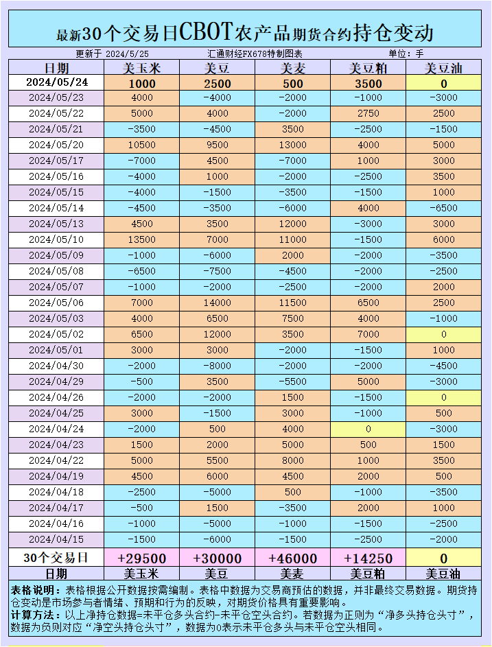 根据汇通财经观察,海外交易商估算的结果显示,本周五(5月24日),大宗商品基金增加CBOT玉米、美麦、美豆、美豆粕投机性净多头头寸,美豆油未平仓多头与未平仓空头相同。最新30个交易日,大宗商品基金增加美豆粕、美麦、美玉米、美豆投机性净多头头寸,美豆油未平仓多头与未平仓空头相同。具体变动数据见图表。