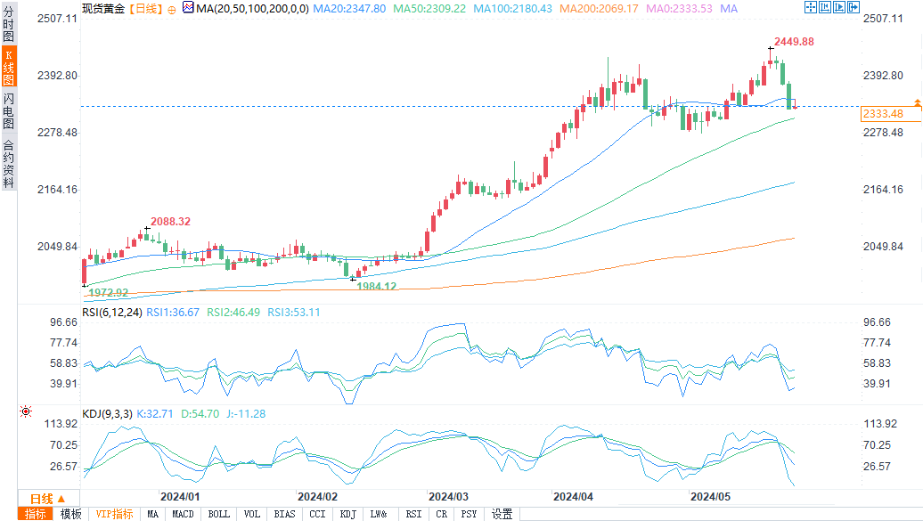 本周晚些时候金价暴跌。纽约商品交易所(Comex) 6月黄金期货较周一2,454.20美元的纪录高点下跌逾100美元。一个不祥的看跌双顶反转形态已经在6月黄金日线图上形成。这表明近期市场已经见顶。这是贵金属市场对周三下午公布的联邦公开市场委员会会议纪要对美国货币政策略微偏鹰派倾向的反应。