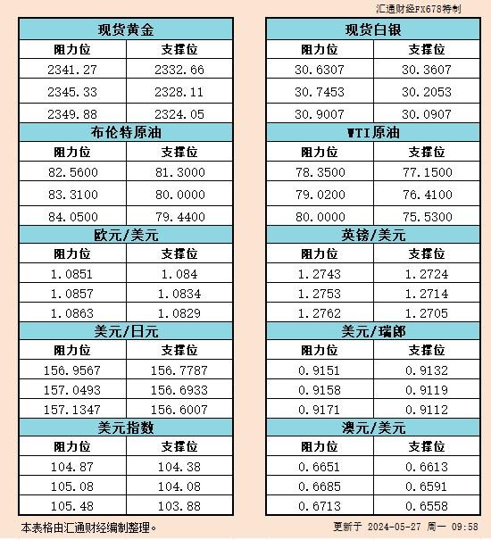 5月27日亚市支撑阻力:金银原油+美元指数等六大货币对