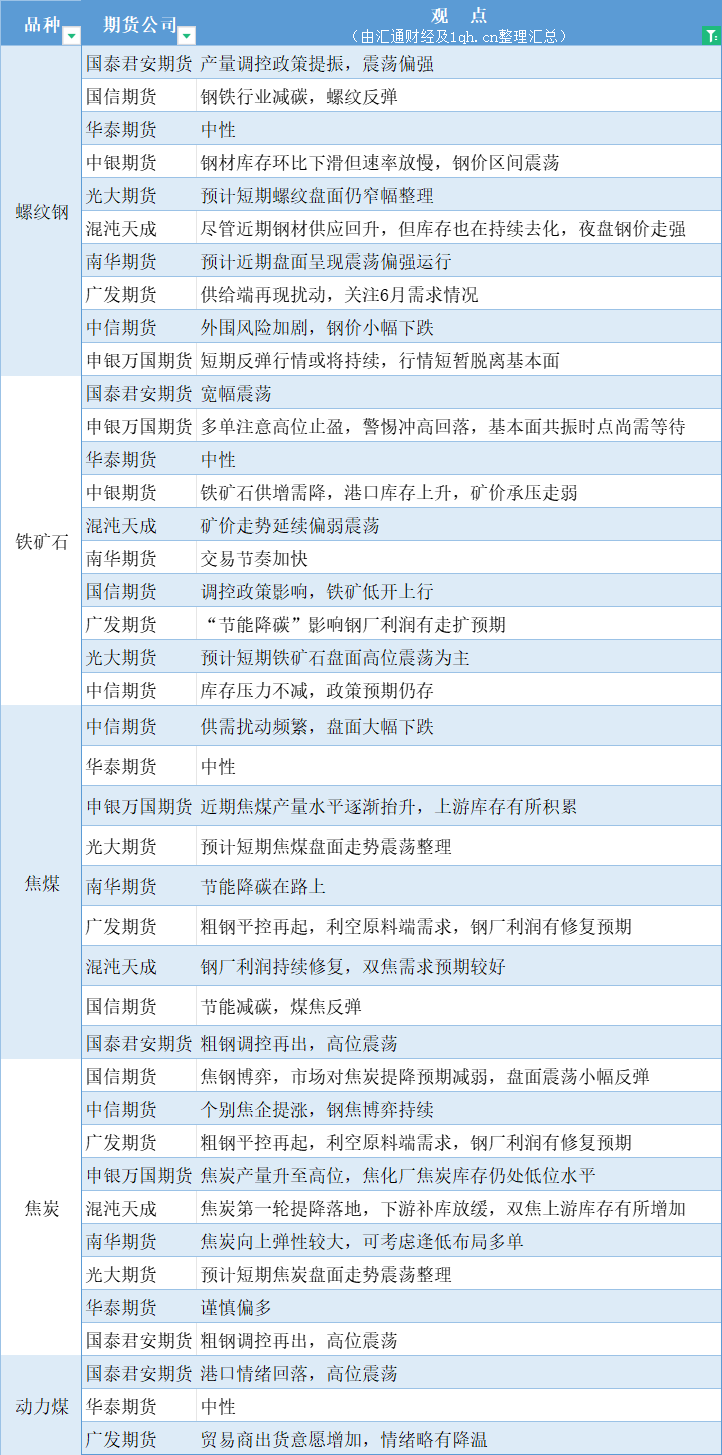 期货公司观点汇总一张图:5月30日黑色系(螺纹钢、焦煤、焦炭、铁矿石、动力煤等)