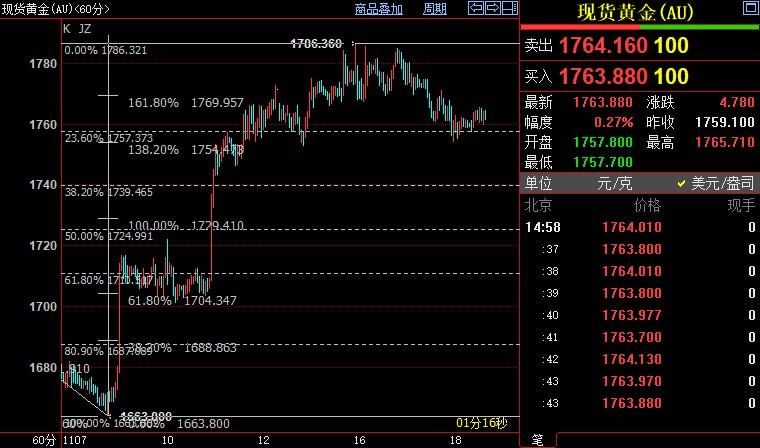现货黄金上浮0.24%至1764.40美元/盎司;COMEX期金主力合约上浮0.20%至1766.6美元/盎司;