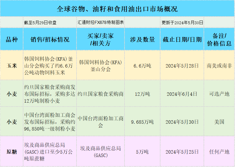 全球谷物、油籽和食用油出口市场招标、采购概况(2024年5月30日):