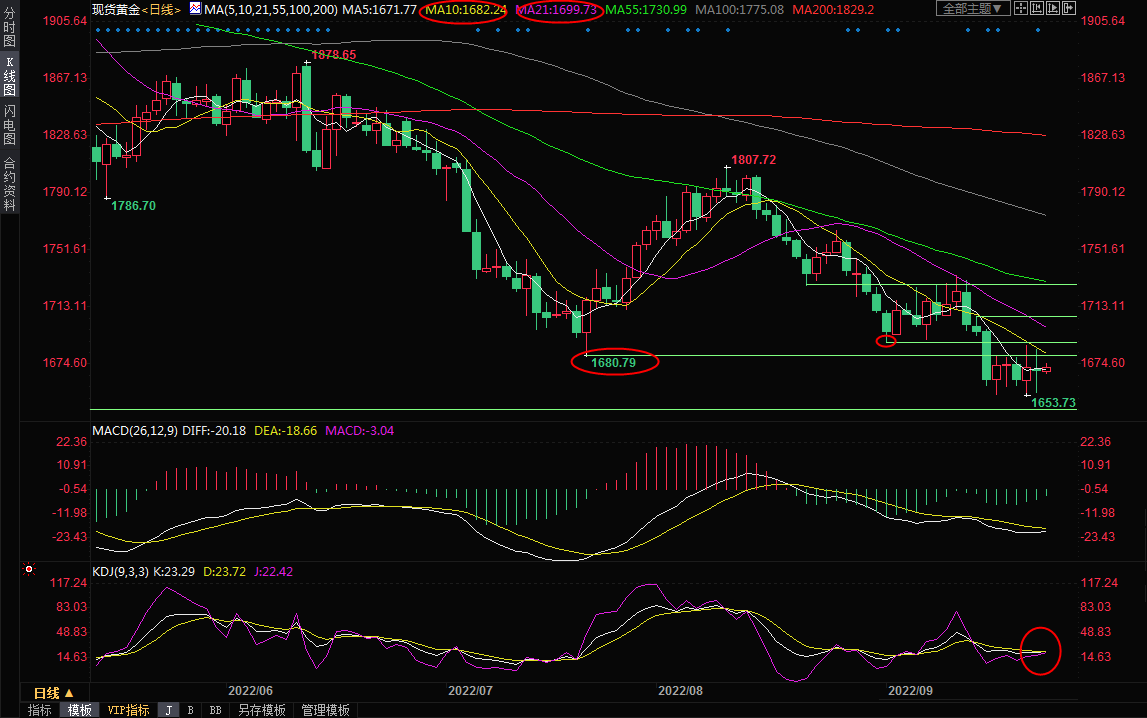 日线级别:震荡下跌;MACD死叉但接近被破坏,KDJ有金叉趋势,金价近一周在1653-1688区域震荡运行,在1653附近获得较强的支撑,下跌动能基本衰竭,短线有望迎来震荡反弹的机会,初步阻力在7月21日低点1680.79附近,10日均线阻力也在该位置附近,若能顶破该阻力,则增加短线看涨信号,9月1日低点阻力在1688.71附近,强阻力在1700关口,21日均线阻力也在该位置附近,若能收复该位置,则增加中线看涨信号。