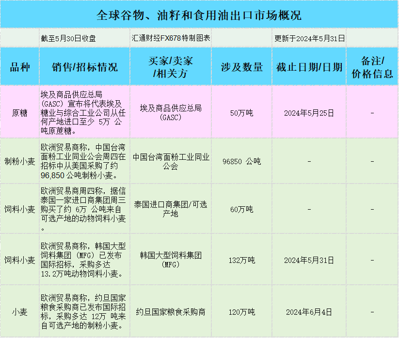 全球谷物、油籽和食用油出口市场招标、采购概况(24年5月31日):
