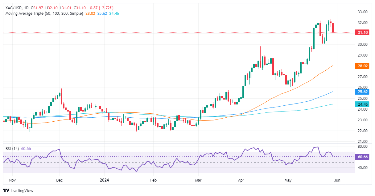 汇通财经APP讯——周四(5月30日),现货白银大跌2.5%,逼近31.00美元/盎司关口。FXStreet分析师Christian Borjon Valencia周四撰文,对银价技术前景进行分析。