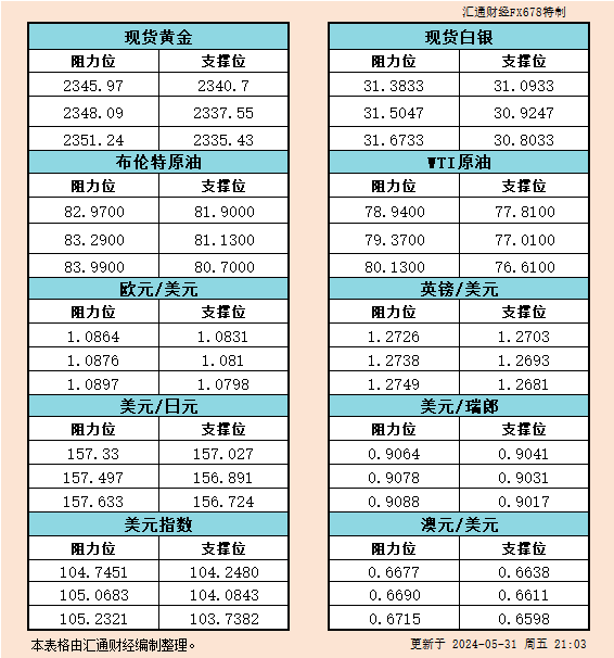 标题:5月31日美市支撑阻力:金银原油+美元指数等六大货币对