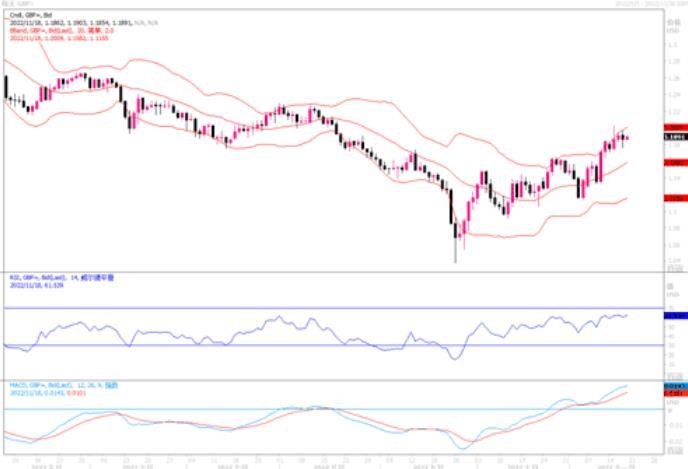 周四(11月17日),欧元对美元略微下跌0.5%,报收于1.0341。据知情人士透露,欧洲央行决策者可能会放慢加息速度,下个月将仅加息50个基点。知情人士提到的理由包括,经济衰退的风险越来越大、消费者价格压力可能会减弱以及将存款利率上调50个基点至2%,将达到接近中性水平,不会再刺激经济。有关这一消息,欧央行的官员未做出回应。距离12月15日欧央行央行今年最后一次决策会议还有四周时间,欧洲央行仍有足够时间做出斟酌。隔夜外汇市场上,虽然上述消息稍不利于欧元,但考虑到美联储也具有减低加息幅度的预期,因此欧元并未因此受到太大的空头冲击。日图显示在1.05关口前,欧元多头遇阻显得上冲力不够,随机指标倾向自超买区域回落,短线警惕回调风险。4小时图高位剧烈拉锯,上行未能再创新高。小时图波幅有所收敛,三角形态即将突破。短线还是要主防冲高回落风险,下方关键的支撑在1.03这个前期横盘区间上沿,若跌穿或就宣告欧元此轮反弹失败。相反,若能坚守在上述水平之上,则后市存在继续尝试冲击1.05的可能性。