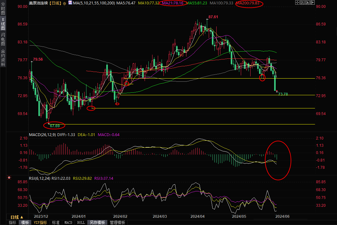 技术面来看,油价跌破5月24日低点76.15水平后,打开了新的下跌空间,看空信号显著增强,短线可能会进一步跌向2月5日低点71.39附近,激进目标则看向去年12月低点67.69附近。上方初步阻力参考2月12日低点75.53附近位置,76.15已经转化为强阻力所在,若能快速收复该位置,则削弱后市看空信号。