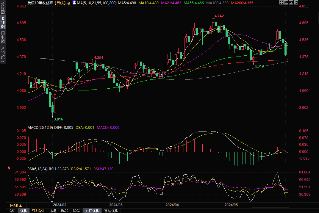10年期国债收益率周一下跌11个基点至4.402%,稍早触及4.392%的5月17日以来最低。