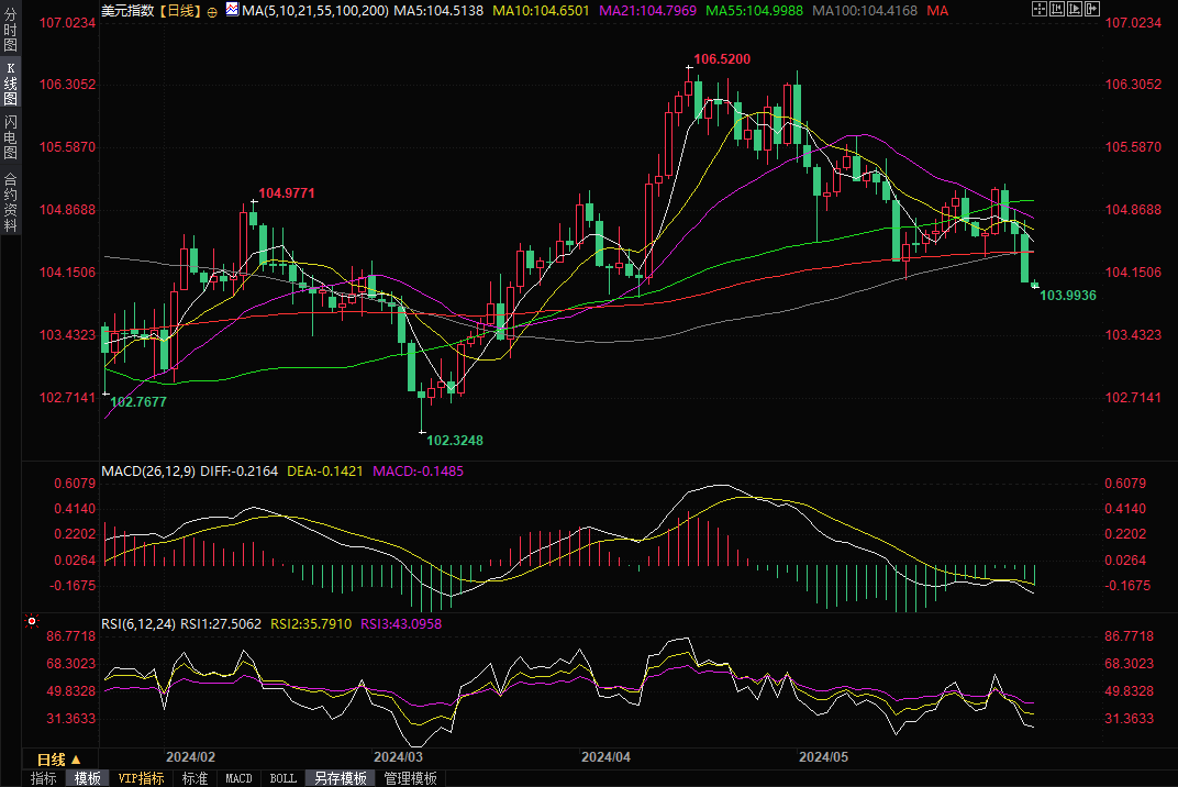 衡量美元对六种主要货币价值的美元指数下跌0.4%至104.14。该指数早些时候跌至104.13,为5月中来最低点。“投资者和市场开始相信,美国的表现优异主题正在开始减弱,”全球支付公司Convera驻奥地利维也纳的全球宏观策略师Boris Kovacevic表示,他指的是美国这个全球最大经济体相对于世界其他经济体的优异表现。