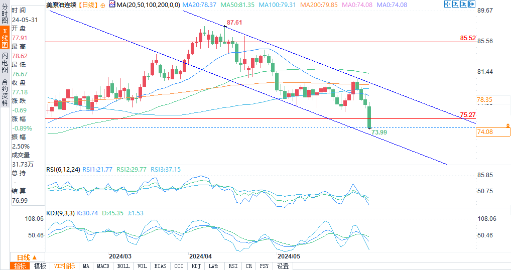 汇通财经APP讯——周二(6月4日)北京时间04:38,WTI原油报74.08美元/桶,跌幅3.78%。原油价格跌至2月份以来的最低水平。