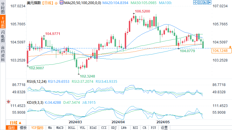 美元指数连续三个交易日一路下跌,目前已滑向104.15区域附近,截至发稿,现报104.13,跌幅0.46%。