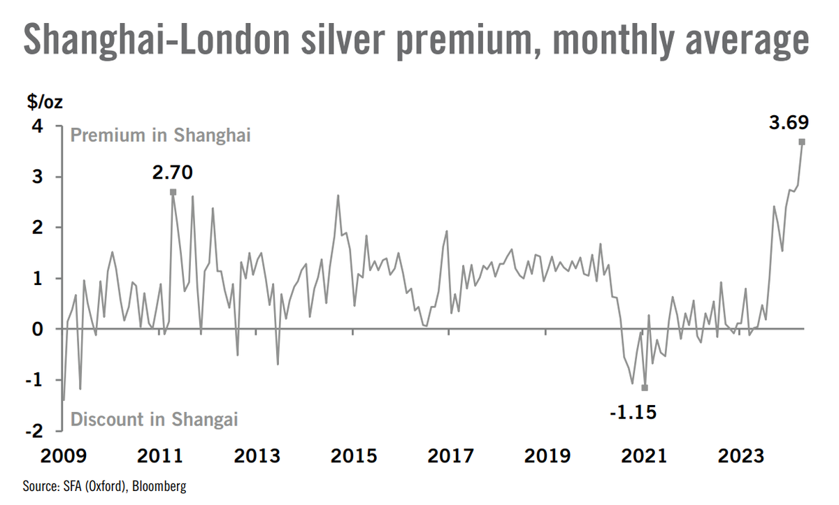 Heraeus表示,“来自强劲的太阳能光伏生产的需求——目前有望超过去年的纪录——将维持中国对白银的高进口需求。这一趋势反映在中国白银市场的高溢价上。今年4月,上海和伦敦白银现货价格之间的月度价差达到了3.69美元/盎司的历史最高水平。套利行为的增加还可能鼓励更多金属流入中国,并进一步收紧其他地区的供应。”