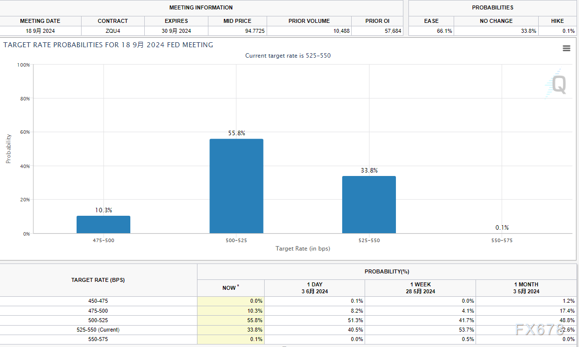 不过,隔夜美国数据公布后,市场对美联储9月降息预期进一步升温,在金价跌向2315后帮助金价反弹至2320关口上方,周二收报2326.62美元/盎司。据CME“美联储观察”,目前市场预计美联储9月至少降息25个基点的概率为66.1%,上周五为50%左右。