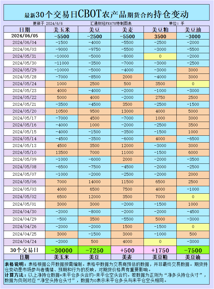 增加CBOT玉米投机性净空头;增加CBOT大豆投机性净空头;增加CBOT小麦投机性净多头;增加CBOT豆粕投机性净多头;增加CBOT豆油投机性净空头。