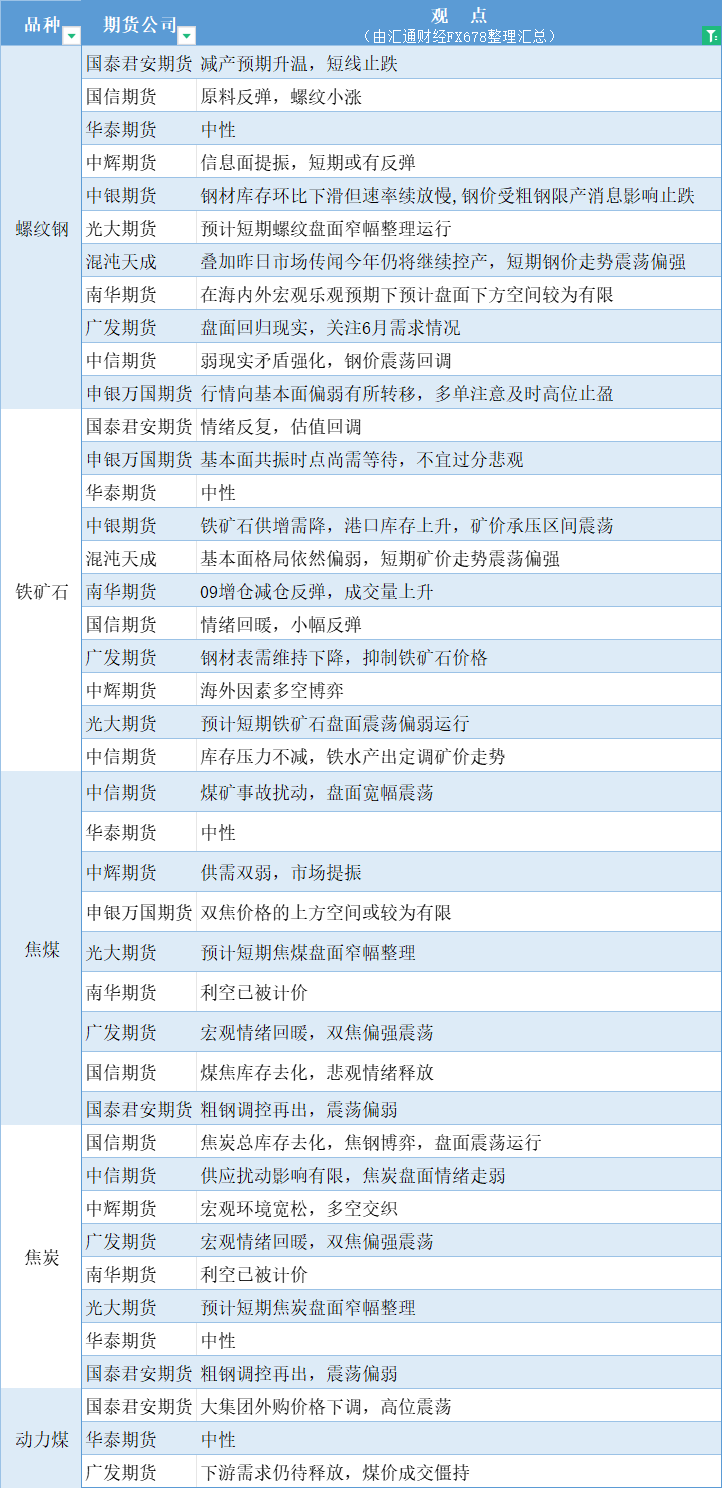 期货公司观点汇总一张图:6月7日黑色系(螺纹钢、焦煤、焦炭、铁矿石、动力煤等)