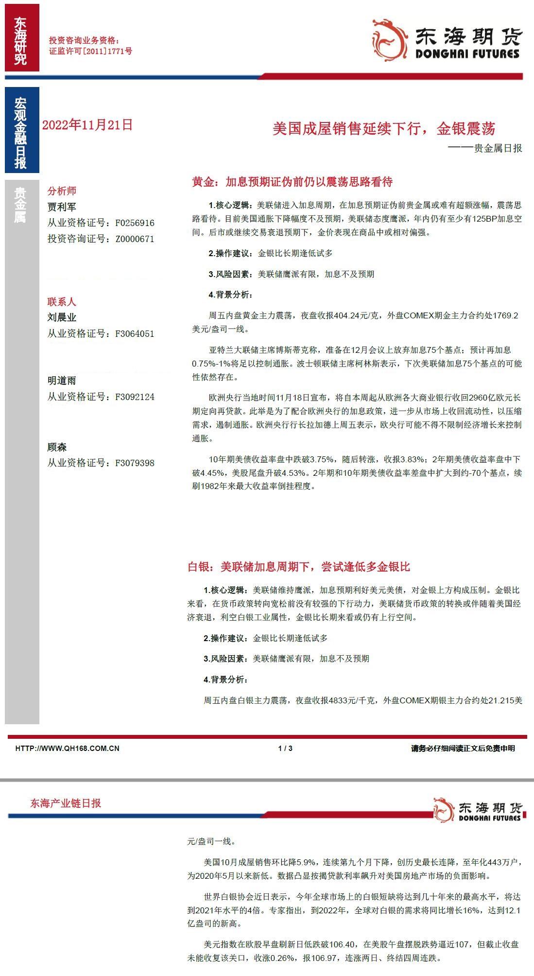 标题:【东海期货11月21日产业链日报】贵金属篇:美国成屋销售延续下行,金银震荡