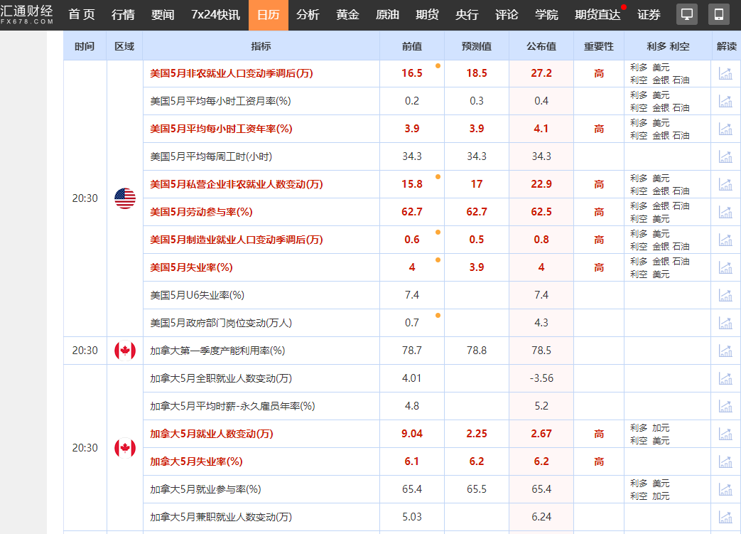 更多见汇通财经FX678特制图表 本图多空基于目前(截止2024/06/07 20:30非农夜)已出炉的最新非农的公布值与前值比较的结果。