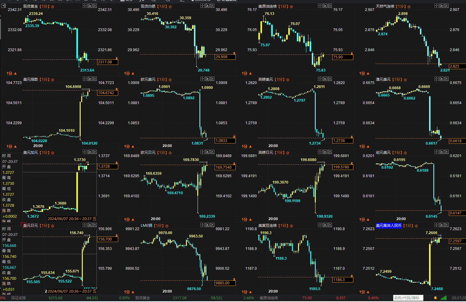 非农报告强势打压美联储降息预期,黄金等非美集体跳水。非农意外增加27.2万超预期强劲,且薪资年率强势升4.1%,失业率虽升0.1个百分点至4%,前两大数据足以打压美联储降息预期。非美资产全线急跌,黄金1分钟跳水近20美元至2313美元/盎司,白银跳水0.55美元至29.748,