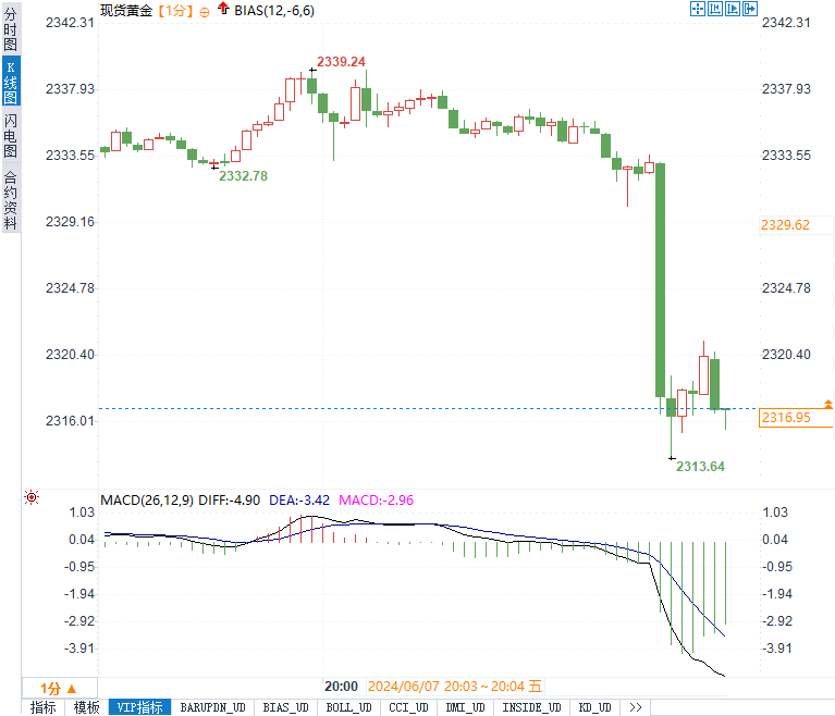 现货黄金短线下挫16美元,现报2318.68美元/盎司。