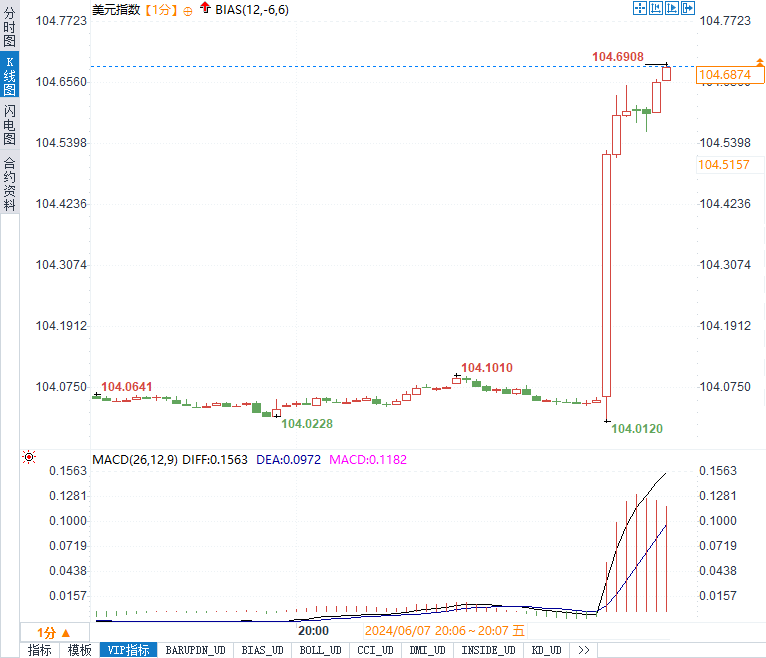 美元指数DXY短线走高60点,现报104.57。