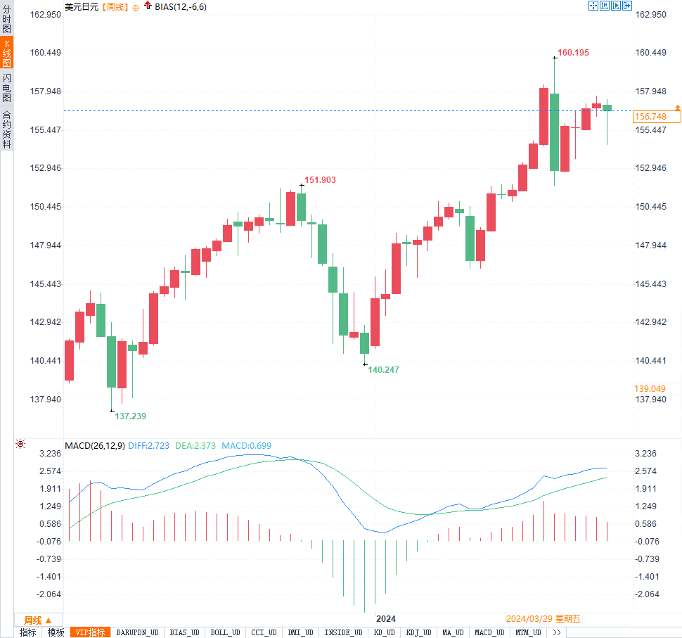 美元兑日元本周周线下跌0.33%。